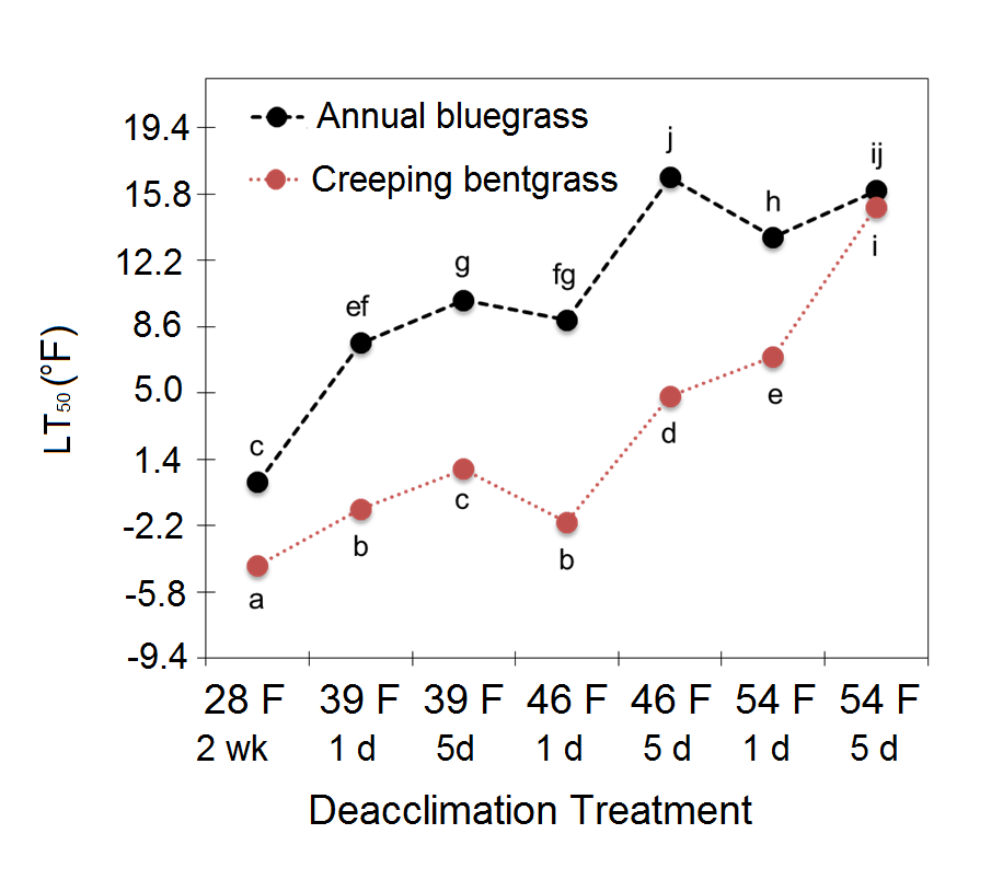 The two grasses were cold acclimated at 36°F followed by 28°F in growth chambers. Then various deacclimation treatments consisting of different temperatures and durations tested the grasses. Researchers found better freeze tolerance for bentgrass (-6°F) compared to annual bluegrass (0°F). Along with less cold acclimation, annual bluegrass exhibited a greater loss in freezing tolerance in response to 39 ° F temperatures (Figure 1). The temperature required to induce greater losses in freezing tolerance was lower for annual bluegrass compared to creeping bentgrass.