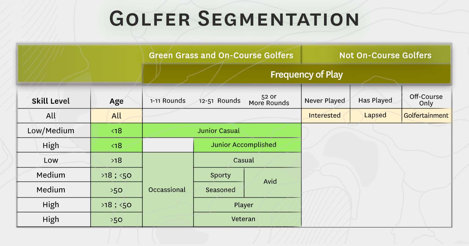 Casual: These golfers are lower on the learning curve, lower on performance expectations and likely newer to the game. This archetype is classified into this group because of their lower skill level. They are the highest-scoring golfers that play 12 or more rounds per year and can be any age.