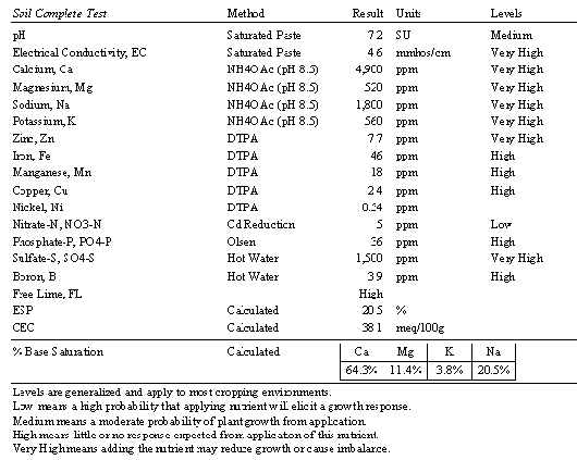 Answer: Total salt content as expressed by the electrical conductivity (EC) is high at 4.6 mmhos/cm (dS/m) as well as the exchangeable sodium percentage (ESP) at 20.5%, which classifies this soil as saline-sodic. Sodium is high at 1,800 ppm, which equates to an EC of 2.8 dS/m (1,800 ÷ 640). This level of sodium may be toxic to salt-sensitive plants such as Poa annua , but not perennial ryegrass. The threshhold EC, above which perennial ryegrass begins to decline, is 6.5 dS/m, thus the EC level in this soil is not at harmful levels yet, but is high enough to warrant salinity reduction strategies such as aggressive aerification, slicing, and leaching. However, the elevated ESP has resulted in soil dispersion and has made leaching difficult. A soluble source of Ca should be applied to improve soil flocculation and lower Na levels. The best and most economical source of Ca is gypsum for this scenario. In order to replace all the Na on the exchange complex (78 meq/l) approximately seven tons of gypsum per acre is required (if you are interested in the math that led to this figure, please contact the SW Region office). Typical gypsum rates range from 1/2 to 1 ton/acre and can be applied on a semiannual or quarterly basis, therefore it will take several years to apply enough gypsum to offset the Na in this soil.