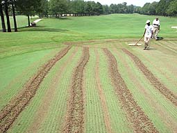 | March madness doesn't only happen on the basketball court. Core aeration is an annual spring ritual on bentgrass putting greens that also tends to drive golfers mad. |