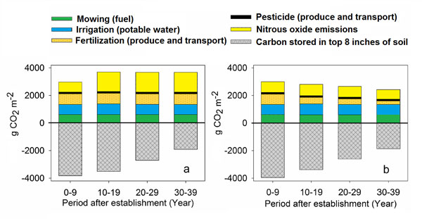 | DAYCENT model estimated greenhouse gas budget for high-quality Kentucky bluegrass roughs using (a) conventional management and (b) best management practices. Carbon dioxide, methane, and nitrous oxide greenhouse gases are converted to g CO2 m-2 for graphical presentation. The gray area represents the amount of carbon that the grass is able to store in the soil as organic matter. In this example, as the turfgrass ages, using lower amounts of a slow release nitrogen fertilizer significantly reduces the carbon footprint of the golf course rough. |