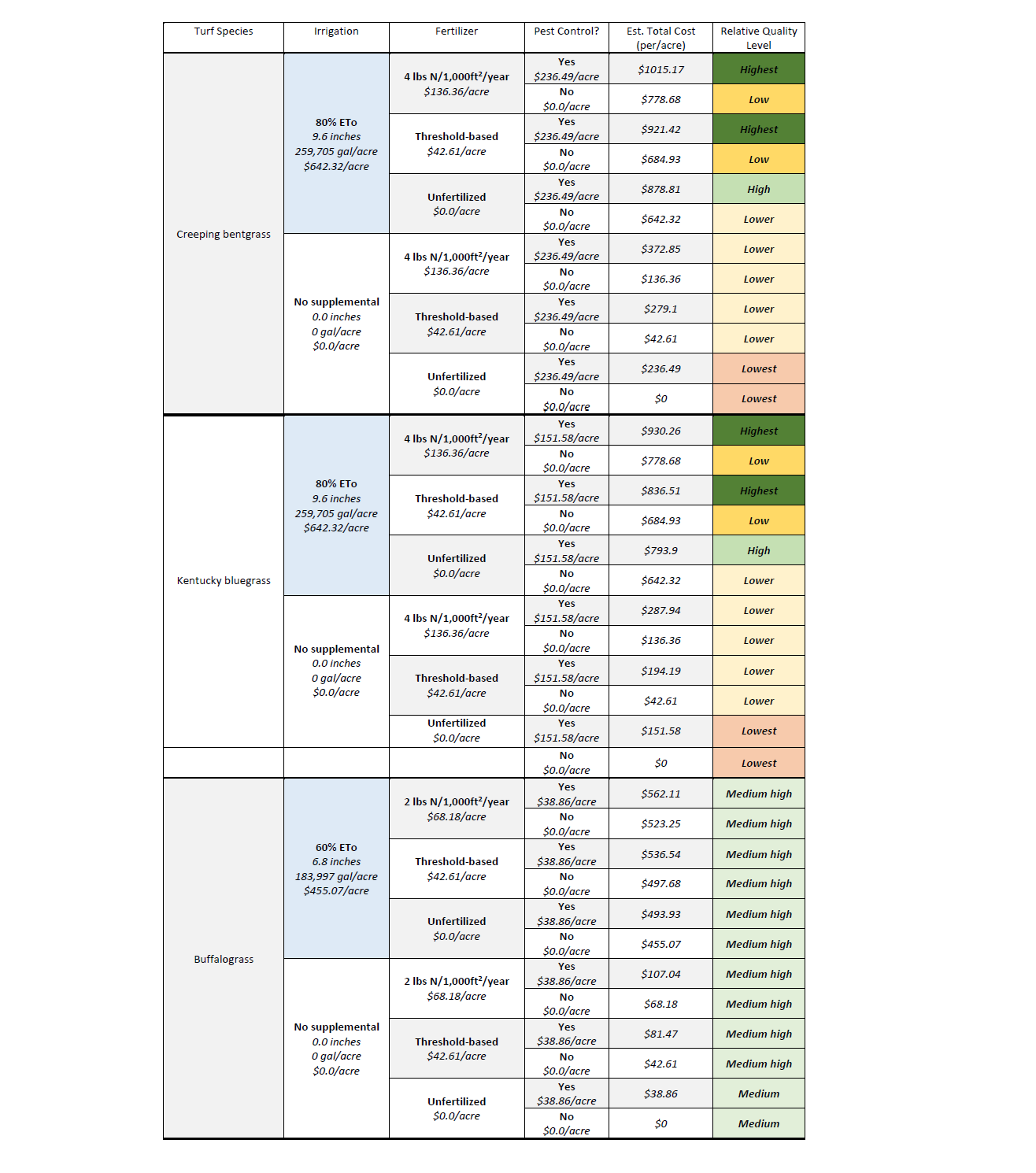 A USGA-funded project conducted at the University of Nebraska is evaluating the performance of fairways comprised of creeping bentgrass, Kentucky bluegrass, or buffalograss under a variety of management conditions. Just one year into the study, results have already shown what most expected to see – creeping bentgrass and Kentucky bluegrass perform well when intensively managed. However, buffalograss has outperformed these species under a low-maintenance regime. This research will provide golf courses with information about the performance and potential resource savings possible with buffalograss. The resource savings associated with a buffalograss fairway from the first year of this research is included in Table 1.