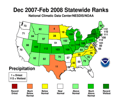 | Winter 2008 precipitation rankings. Source: NOAA. |