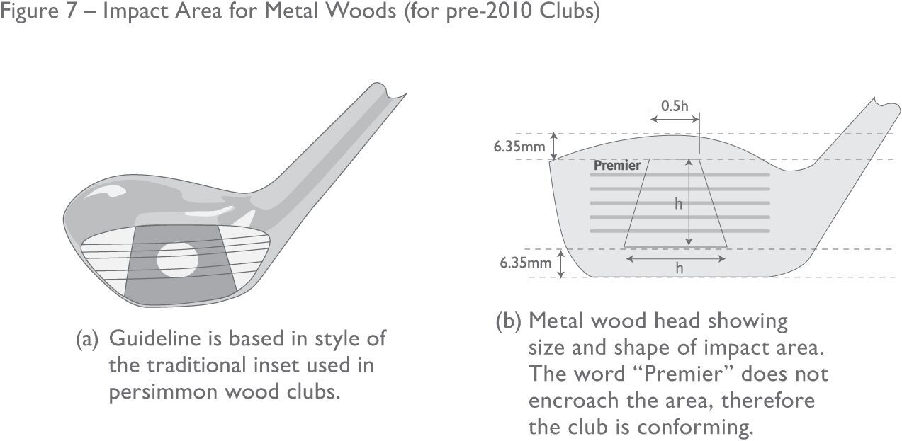 For iron clubs, the “impact area” is deemed to be that part of the face which lies within 0.79 inches (20 mm) either side of the vertical centre line of the face, but excluding strips 0.25 inches (6.25 mm) wide from the top and bottom edges.