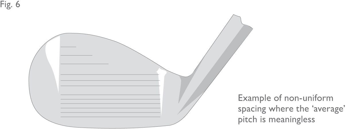 12. For grooves with markedly varying separation (See Figure 6 below), the above procedures need modification, though the same measuring technique applies. In general, the concept of average groove pitch has to be abandoned and groove pitch (or separation) taken for individual pairs of adjacent grooves. In the sample illustrated, the club face would need to be divided into two or even three separation regions.