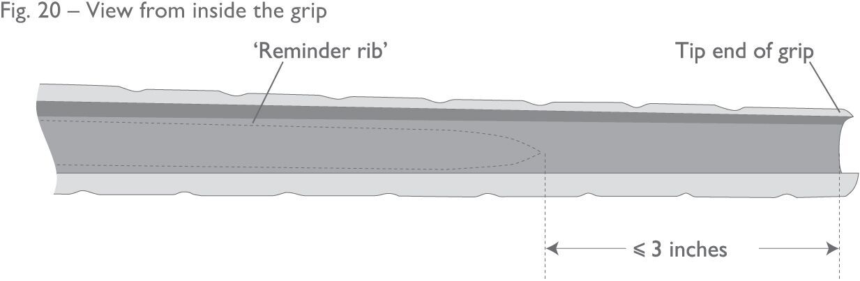 In the case of a standard length grip (approximately 10 inches (254 mm) in length), the “full length of the grip” is interpreted to mean that the rib must extend to within 3 inches (76.2 mm) of the tip (see Figure 20).