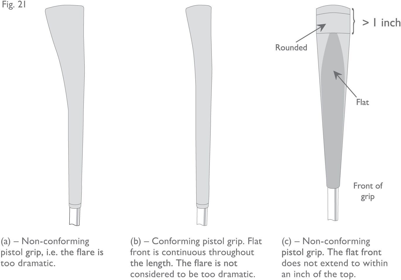 In order to accommodate the popular (and somewhat traditional) “pistol-type” putter grips and also limit the amount of potential offset, the phrase “generally similar” is interpreted to mean: (i) that the butt (top) end of the grip must not involve a sharp change in slope or dramatic flare on the underside (see Figures 21(a) and (b)); (ii) that the flat front must extend to within 1 inch (25.4 mm) of the top and bottom ends (see Figure 21(c)); and (iii) if the axis of the grip and the shaft do not coincide, the grip must be at least 10 inches (254 mm) in length.