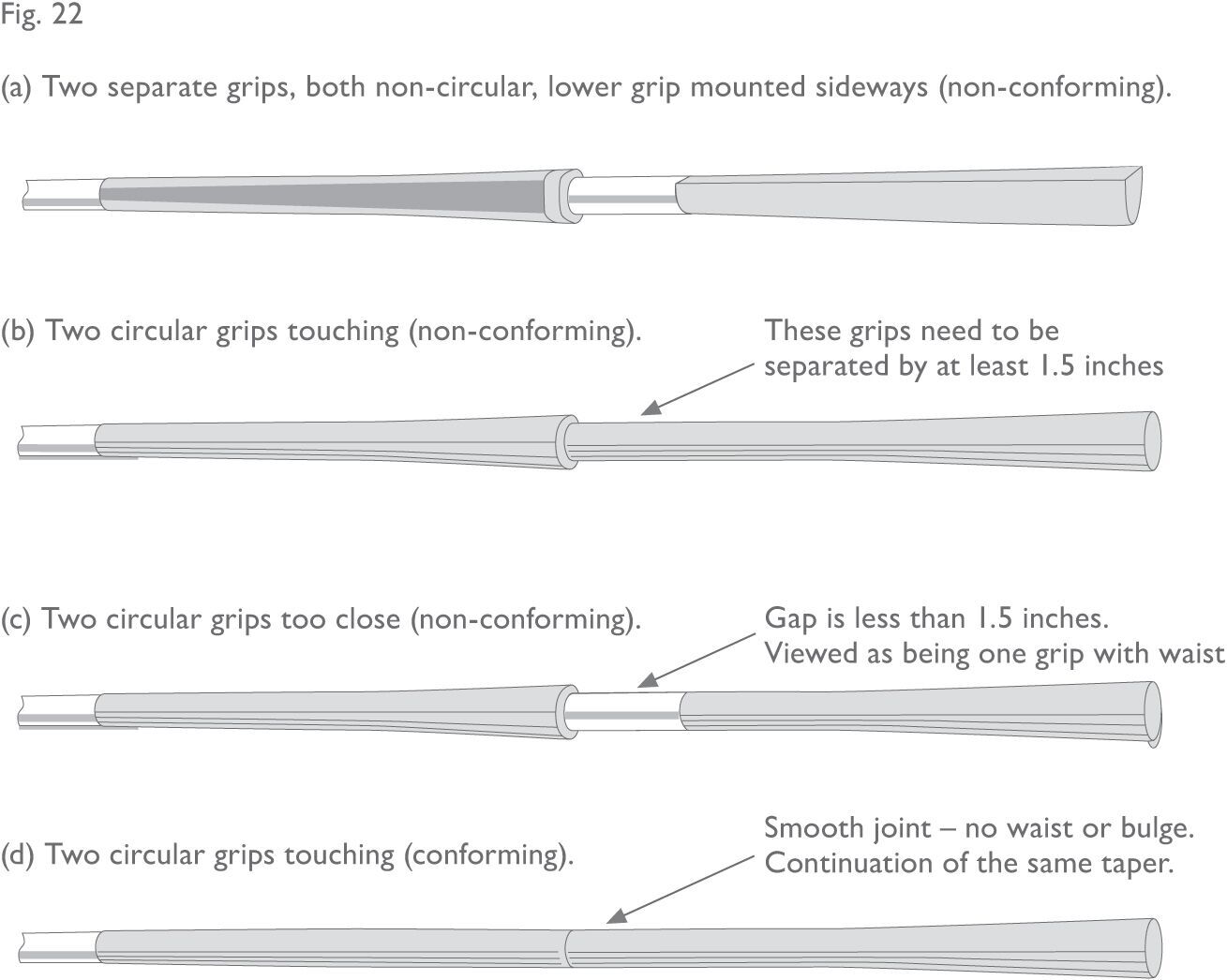 Where a putter has two grips, these grips are only considered separate if the gap between them is at least 1.5 inches (38.1 mm) in length. If a smaller gap exists, or if no gap exists, the total length from the bottom of the lower grip to the top of the upper one would be considered “one grip”. Therefore, it is unlikely that the grip would conform if two conventional circular grips were installed without the required gap. Either the exposed piece of shaft between the two grips would constitute a waist, or the point where the two grips meet in the middle would cause a bulge. If there was no gap between the upper and lower grip, the grip could conform if the lower grip is a continuation of the upper grip, i.e. a continuation of the same taper, and the transition between the two sections is smooth (see Figure 22(d)).