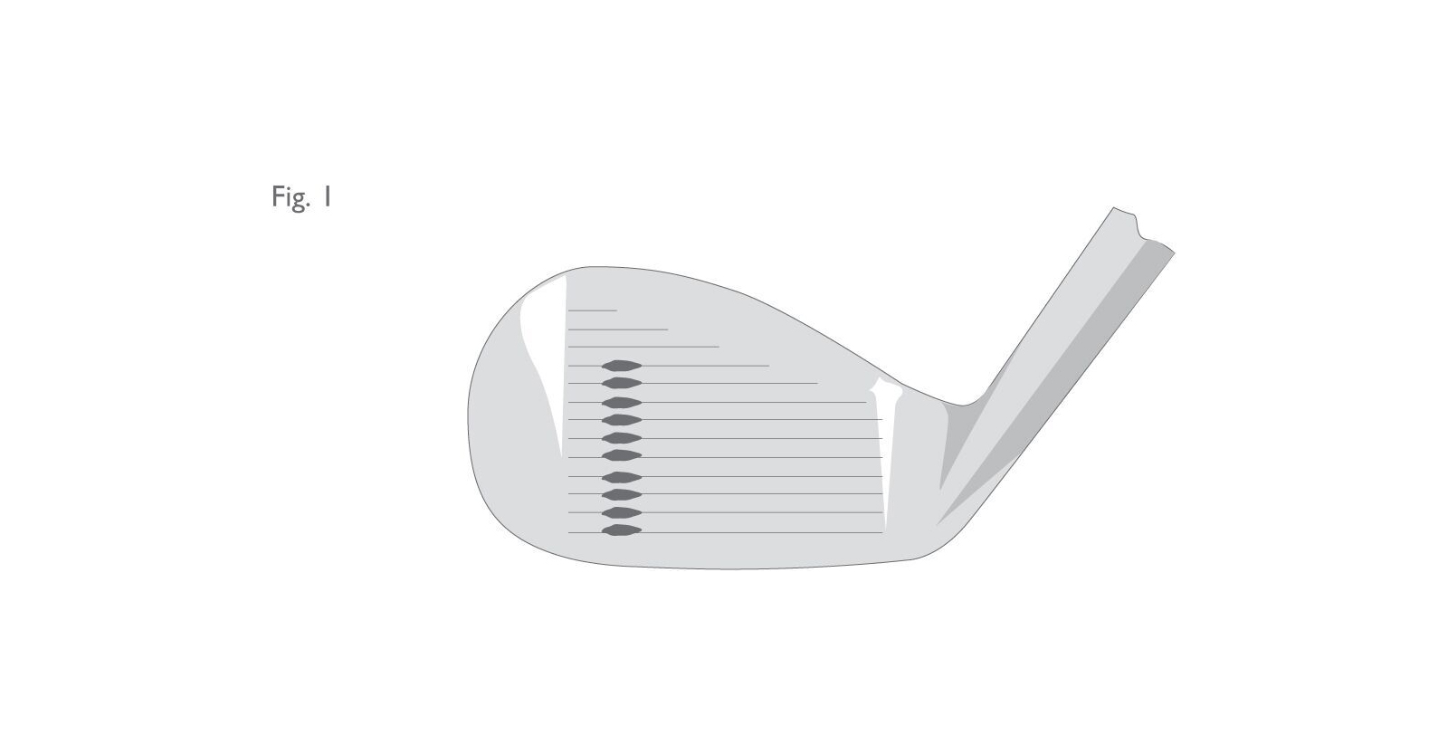 2. Use the marker pen to coat a 0.25 to 0.5 inch (5 to 10 mm) width of the edges of ten grooves (and the nearby part of the flat area between them), making sure that the ink gets down into the grooves. The inked pattern thus formed should lie in a line running from sole to top edge of the club face. For new clubs do this about 0.5 inches (10 mm) to one side of the centre of the face (See Figure 1 below). For used clubs do it near the toe, but not at the very end of the grooves (but see also Paragraph 13).