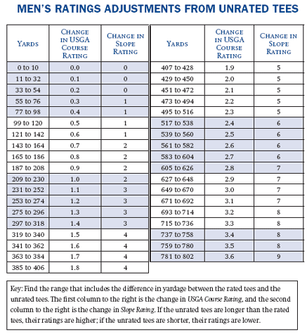 Add the resulting table values to the ratings of the nearest set of tees rated for the appropriate gender if the unrated tees are longer than the rated tees, or subtract the resulting values if the unrated tees are shorter than the rated tees.