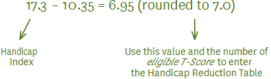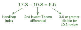Step 2: Subtract the second lowest T-Score Handicap Differential from the Handicap Index under Section 10-2. Continue with the next step if the result is 3.0 or greater.