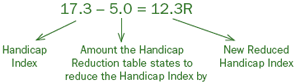 Step 6: Subtract the table value from the player's Handicap Index. The result of that subtraction will be the player's reduced Handicap Index, provided that it is at least 1.0 less than the Handicap Index based on the formula in Section 10-2. The reduced Handicap Index is to be identified with the letter R when displayed in handicap reports or on the computer screen (e.g., 12.3R).